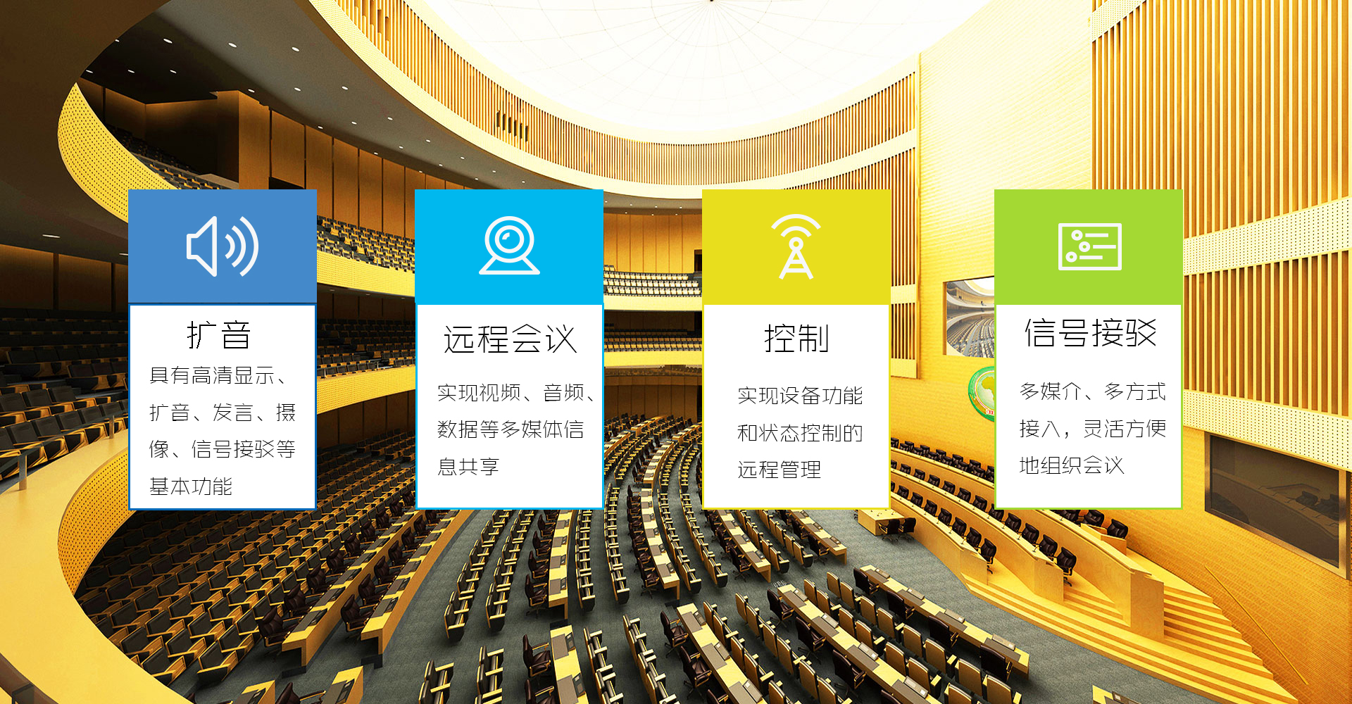 智能化會議系統具有高清顯示、擴音、發言、攝像、信號接駁等基本功能,同時也應具備智能化管理功能;實現視頻、音頻、數據等多媒體信息共享;實現設備控制和狀態的安全遠程管理;具有會議預訂、變更、查詢、錄播、權限設置等會議管理功能;具有應急響應功能;可實現在會議中的無縫切換,保障會議平穩進行;多媒介,多方式接入,靈活方便地組織會議。